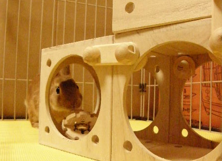 齧り木ボールをくわえてキューブハウス内へ…