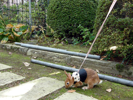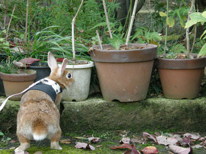 ゆずにハーネスを着せて庭んぽ。